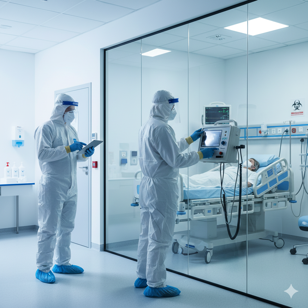 Fully equipped ICU with modern ventilators, monitoring systems, and isolation rooms for comprehensive critical care management.